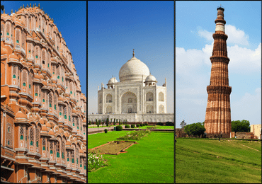Destinations : Delhi → Red Fort, India Gate, Qutub Minar → Agra → Taj Mahal, Agra Fort → Jaipur → Amber Fort, City Palace, Hawa Mahal
